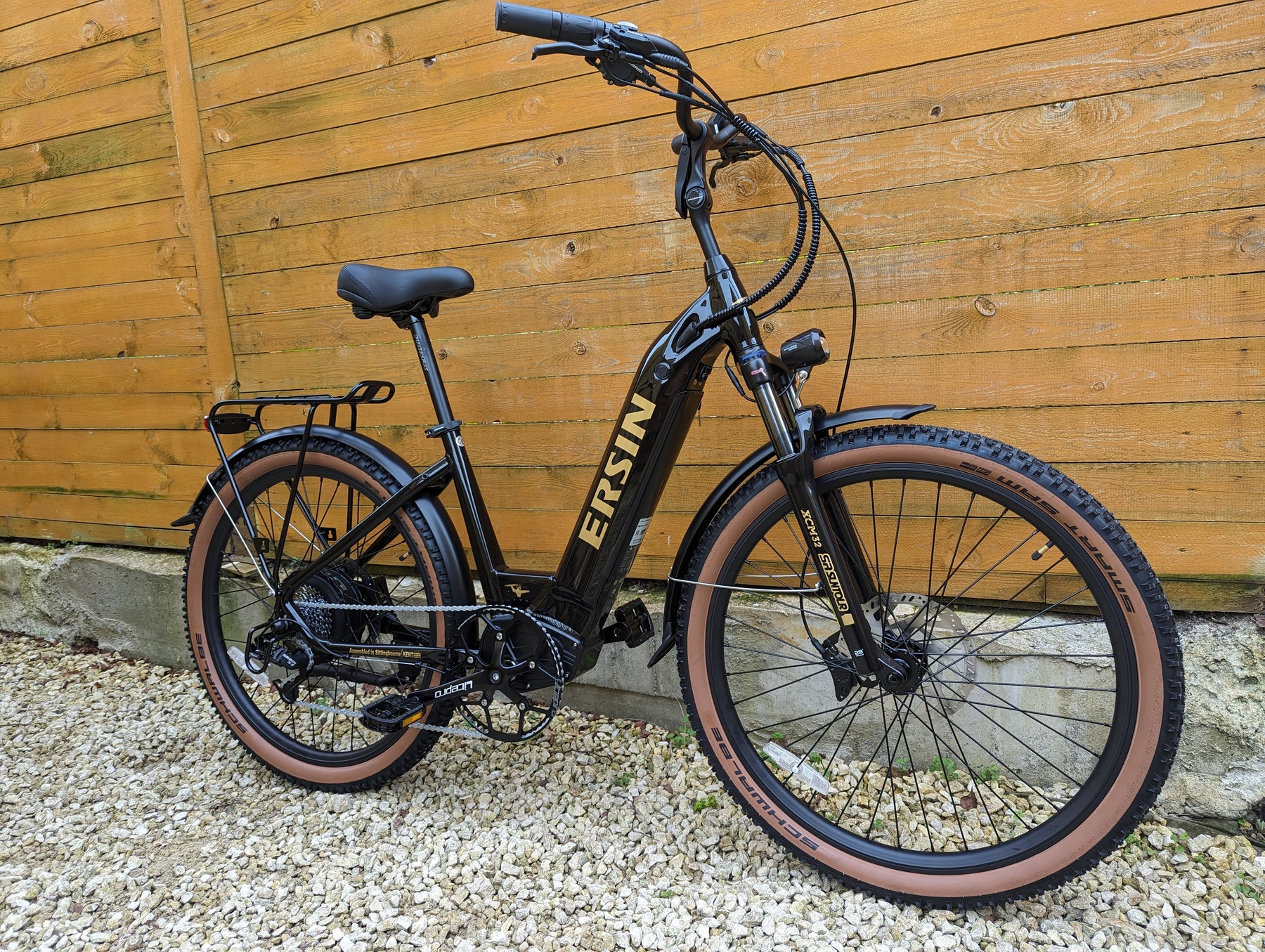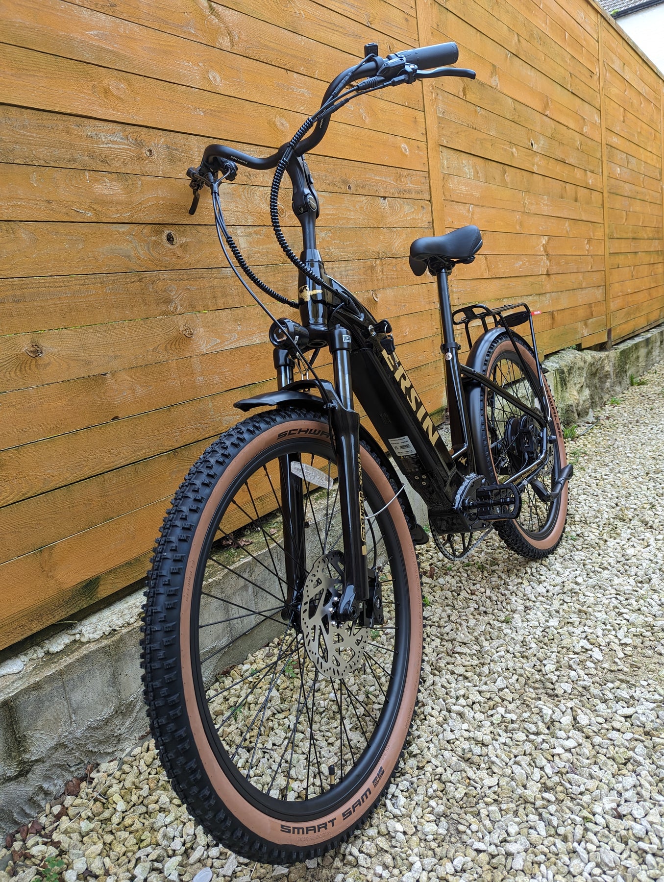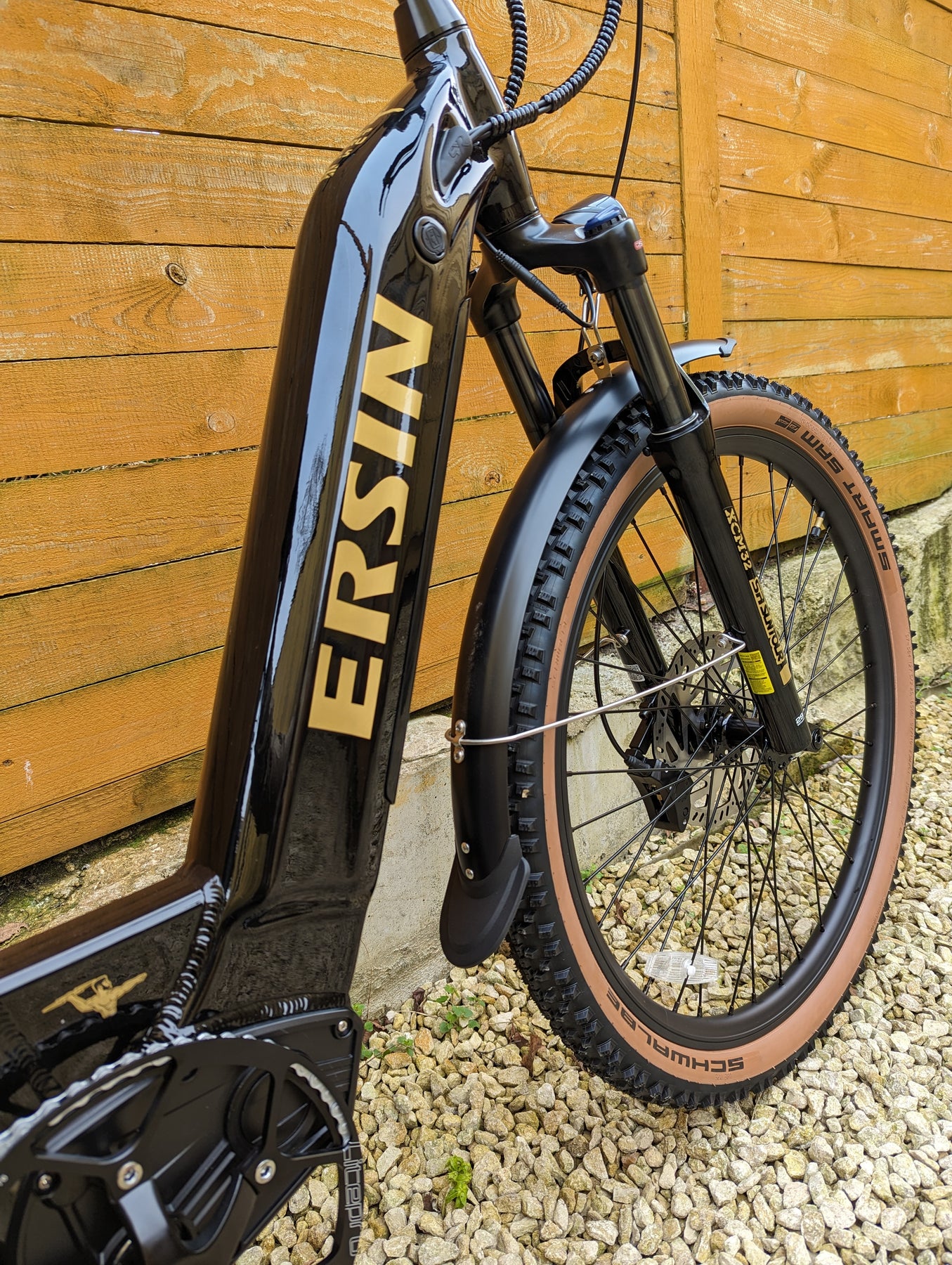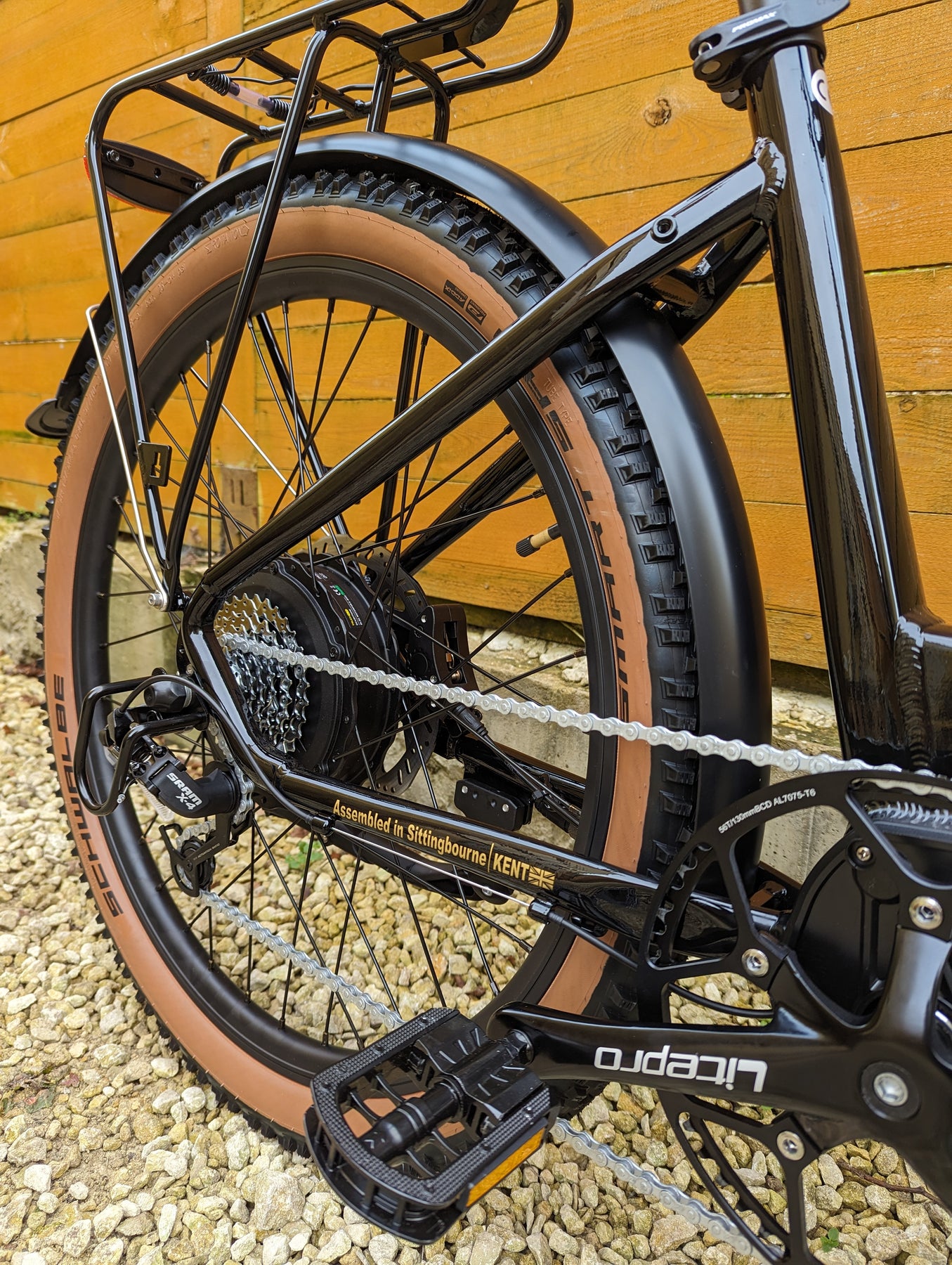 Upgrades: Tan Wall tires, All Black Forks with Axle Thru, Sram Gears, Sram X4 trigger shifter, Sram X4 derailleur, Stainless steel screws all round, Thicker spokes, Zinc plated chain, D710 XOD calipers, 203mm thicker rotors, Huge 56T crank, Softer and thicker seat, Upgraded lights, Metal folding pedals.