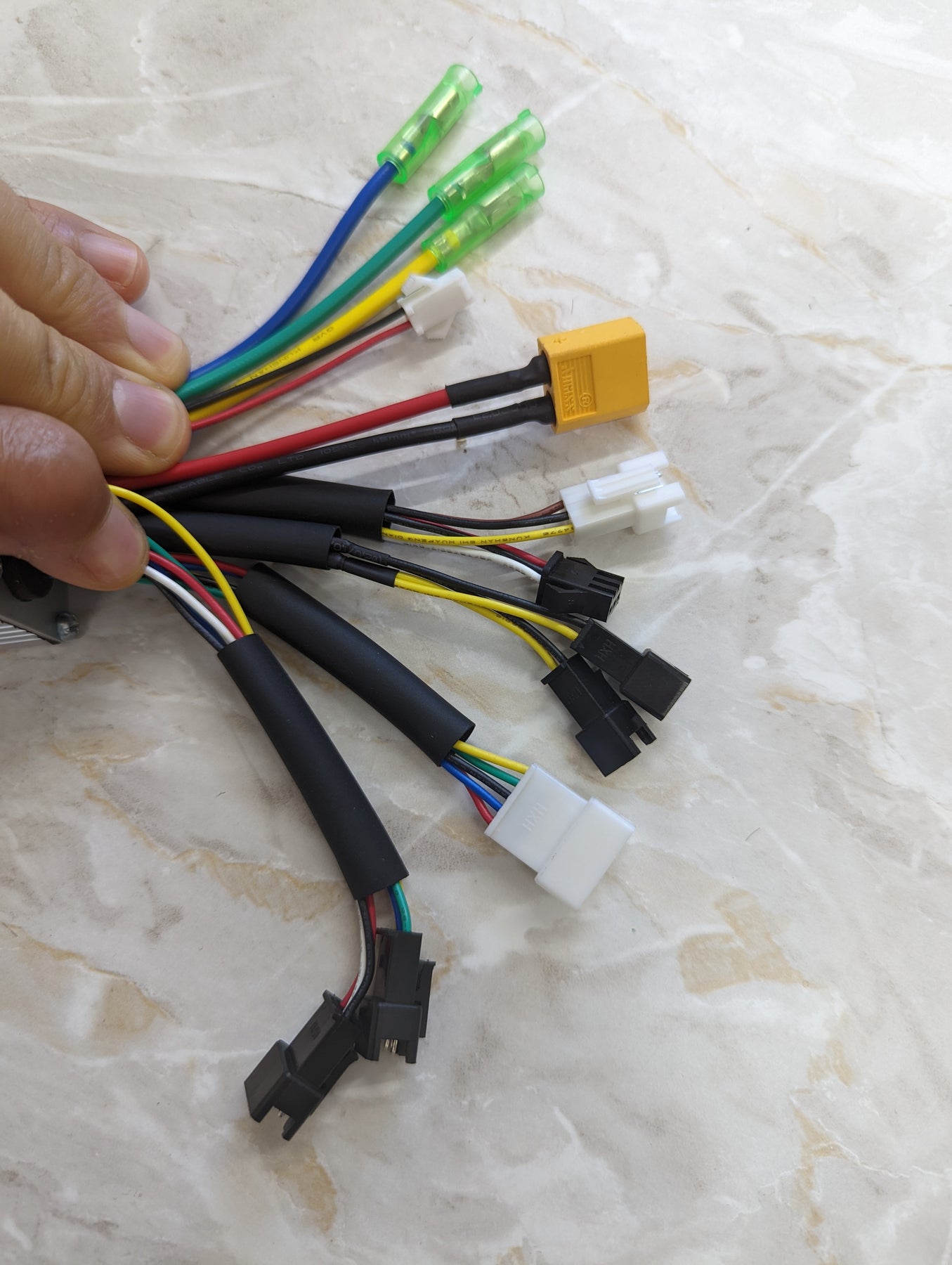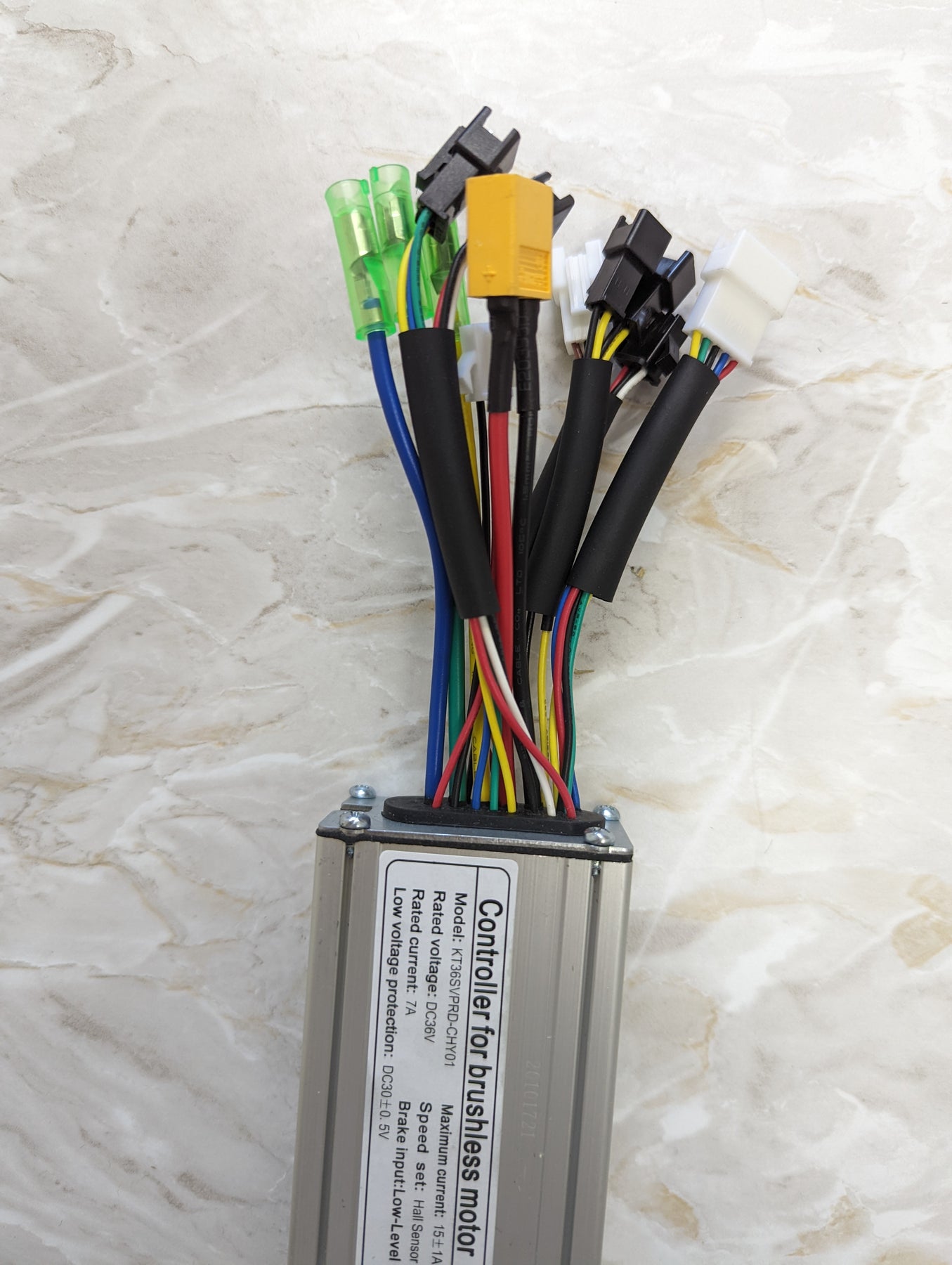 This controller is used on wide range of folding e-bikes. This device is rated at 36V  and can handle motor sizes between 250V-350V easily. There are connections to attach and operated many functions such as headlights that are controlled by the LCD screen via this controller.  This is the brain of  the e-bike and can be fully adjusted to needs. it will control LCD screen, motor output, battery power output, brakes cut off function, lights ect.